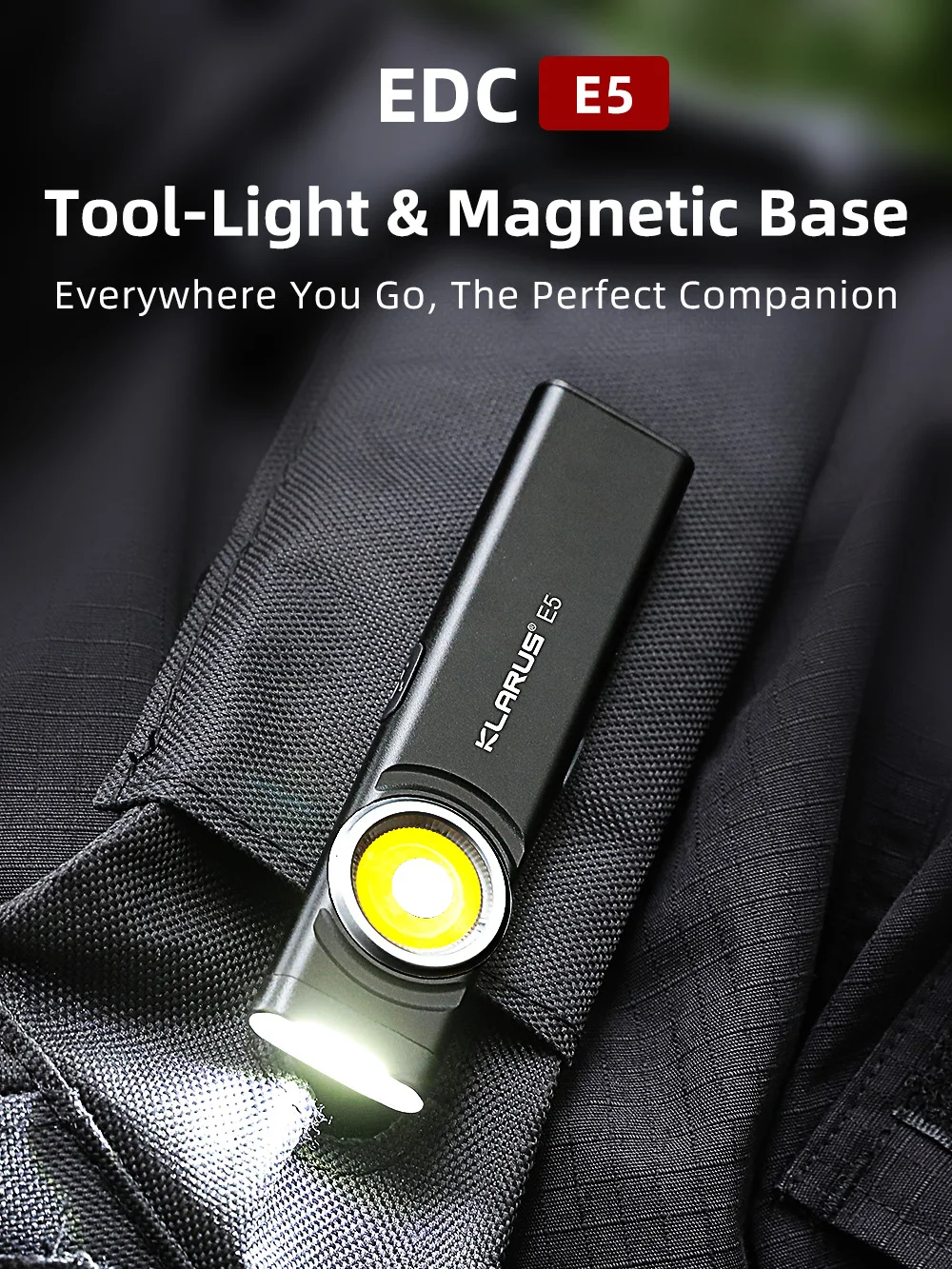 Klarus E5 COB Flashlights Magnetic Dual Light Torch 8 Lighting Modes USB C Rechargeable EDC Flashlight Strobe for Emergency Use